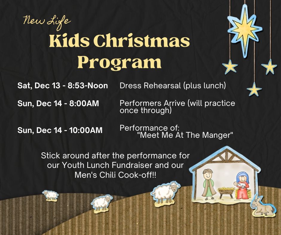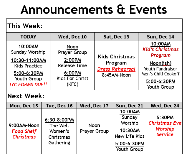December 22nd through January 3rd there will be no regular ministry events. Ministries will resume as usual the week of January 4th. Please note that there will be no Sunday Worship Service on December 28th due to a very busy Christmas week schedule and also to give our many volunteers and staff time off with their families. Instead of gathering at New Life, we invite you to slow down and gather as a family and worship our Newborn King, Jesus, together with your loved ones. Click Here to see our December calendar.
